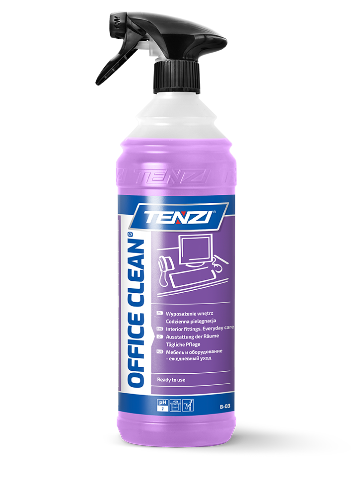Office Clean - универсальное средство для уборки и ухода за офисной мебелью и оборудованием. C pH 7 и приятным цветочным ароматом, оно не оставляет разводов, быстро высыхает и сохраняет натуральные свойства обработанных поверхностей. Экономичное в использовании (1-2мл/1м2), оно рекомендуется для мебели из дерева, пластика, ламината и стекла.